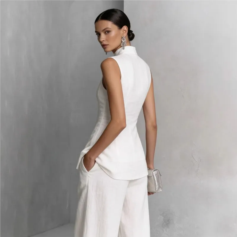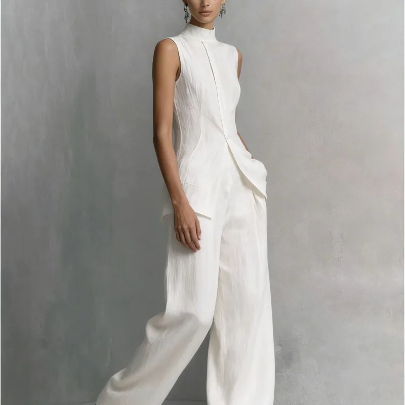 Designed with a sleeveless turtleneck top for a modern elegant look.
